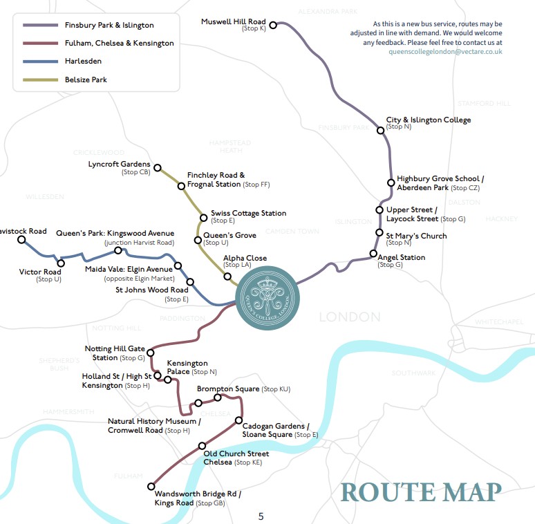 To Book: Please visit queenscollegelondon.vectare.co.uk to make a booking. Other amendments and changes can also be made via the ‘My Account’ section of the website. If you need any further assistance, or you would like to discuss travel options from areas not currently served by our network, please email queenscollegelondon@vectare.co.uk.